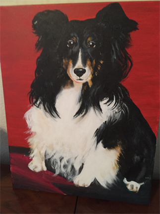 Bella was fostered, then adopted, by Susan. Bella was truly Susan's "heart dog," one of those very special pets that so completely wrap them around our hearts despite being one beloved pet among many over the years. This portrait of Bella was done by her grandson with much love for his grandmother.