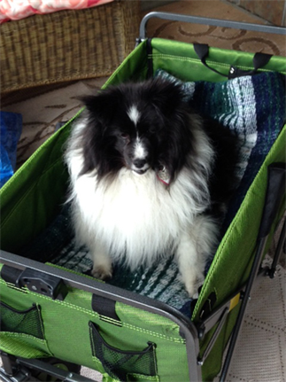 Unfortunately, Lilly was diagnosed with Cushing's Disease a short while after being adopted. Still, she persevered, and everyone always commented on how cute she was, and recognized her appealing virtues. She was adored by all. When she couldn't walk anymore, I used to pull her around in her green cart (photo attached). People loved it and would stop to talk to her and pet her. She was alert and beautiful until the end. Although her life was cut short, Lilly was the perfect dog, a joy and sweetheart, and I feel very lucky to have had her for the two years that I did. I am going to miss her terribly. Lynne